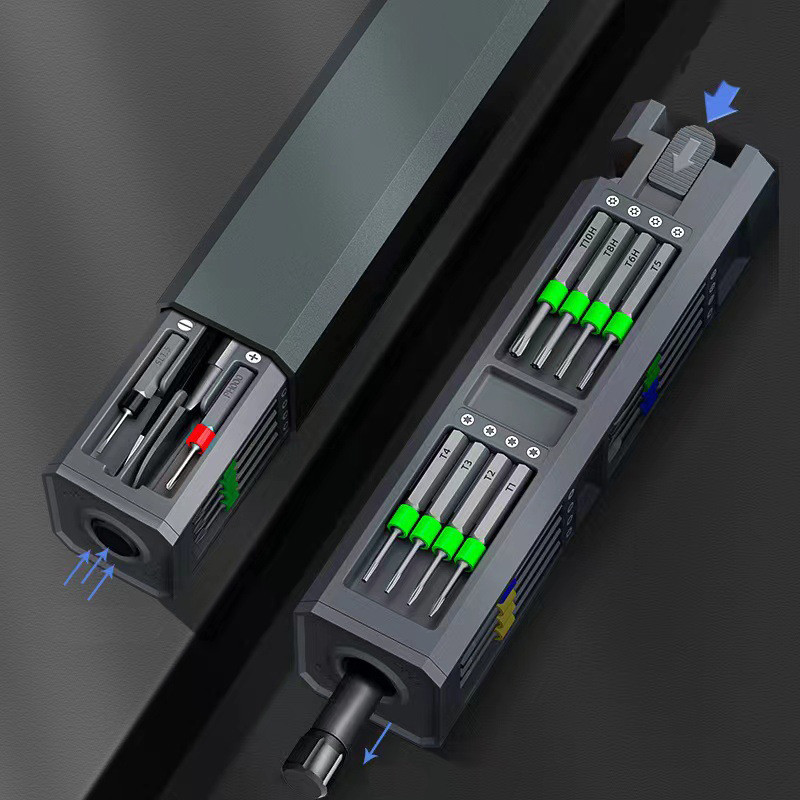 Beépített kilökőgomb, egy kattintással felugró bittartály , tartsa a helyén az összes csavart, hogy ne essen le. A mágnesezett hegyek javítják a csavarok kezelését és kezelését.