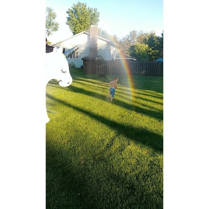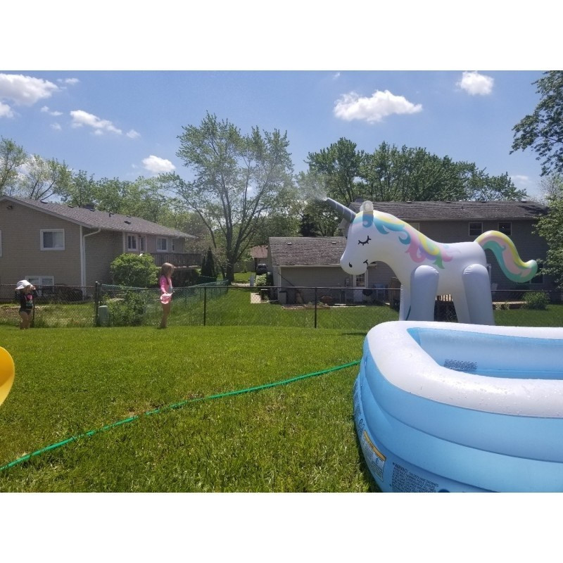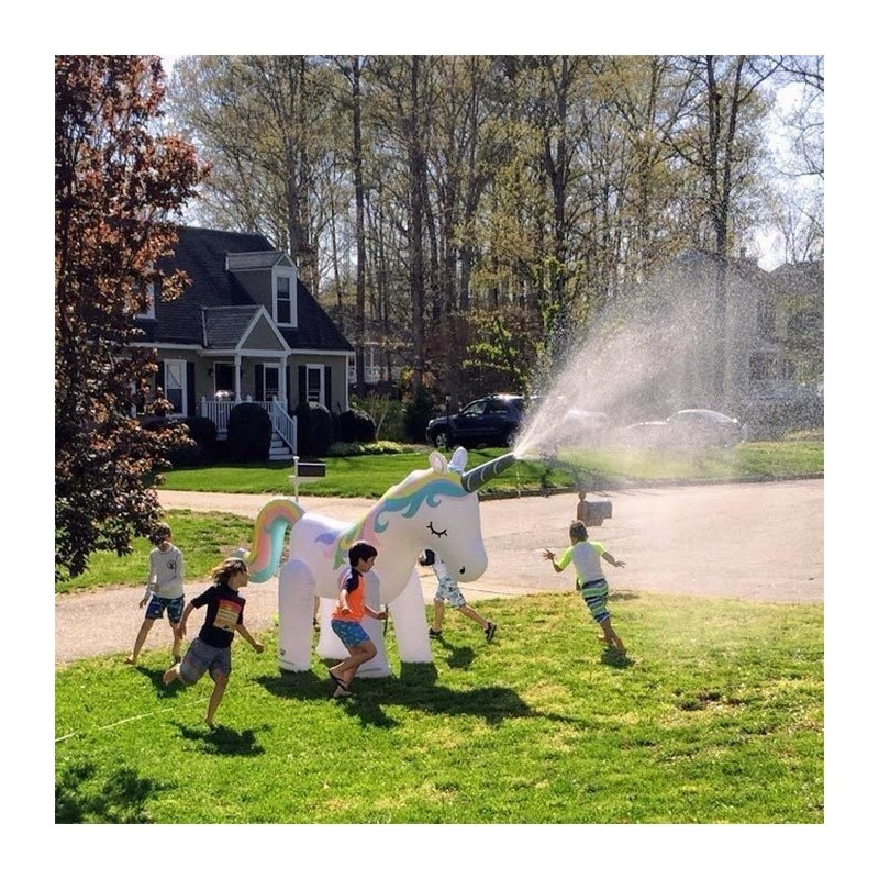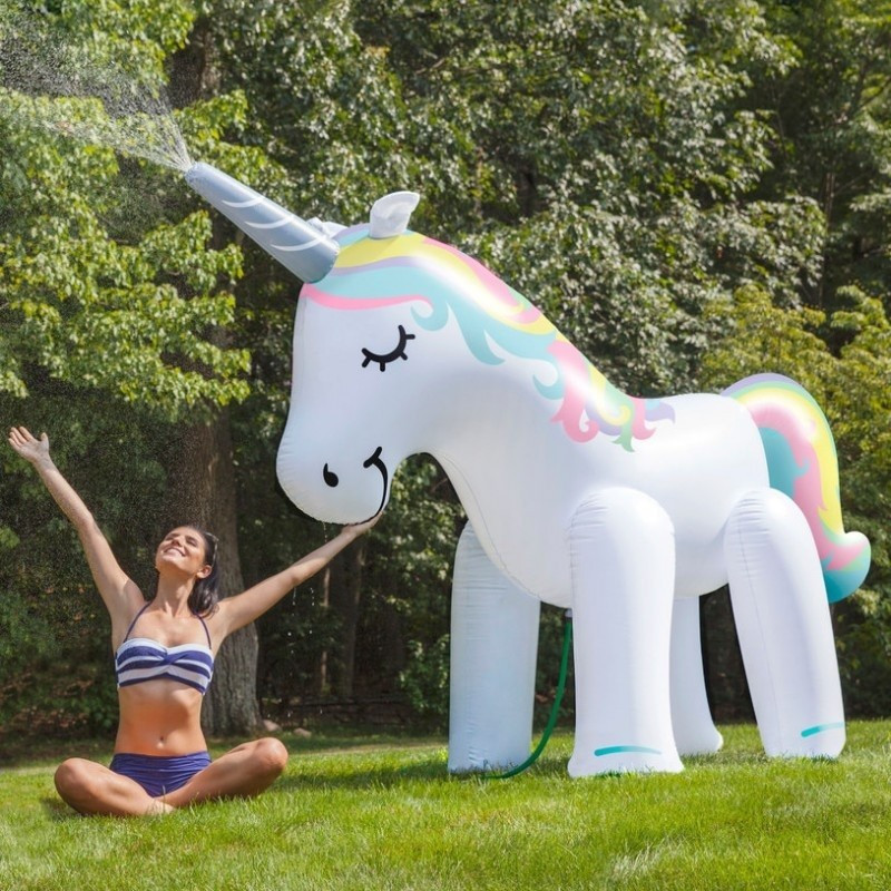 Csak fújd fel és csatlakoztasd egy szabványos kerti tömlőhöz, majd nyisd meg a vizet és az unikornis szarva frissítő vizet permetez.