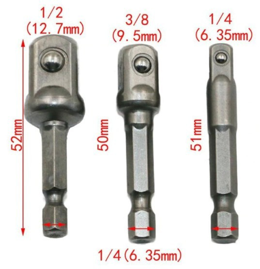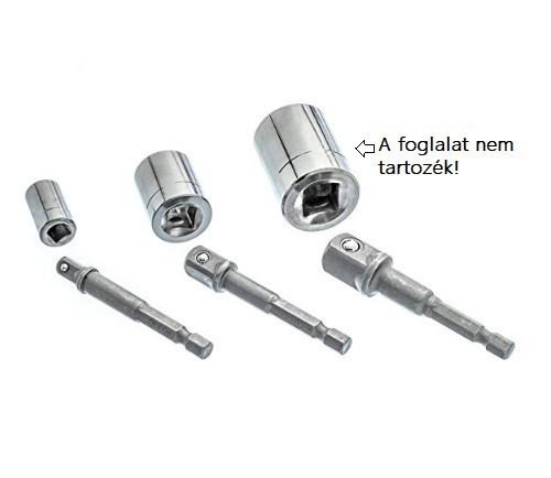¼-es hatszög befogású adapterekkel rendelkezik, 3 különböző méretű dugókulcsokhoz: 1/4 3/8 1/2.