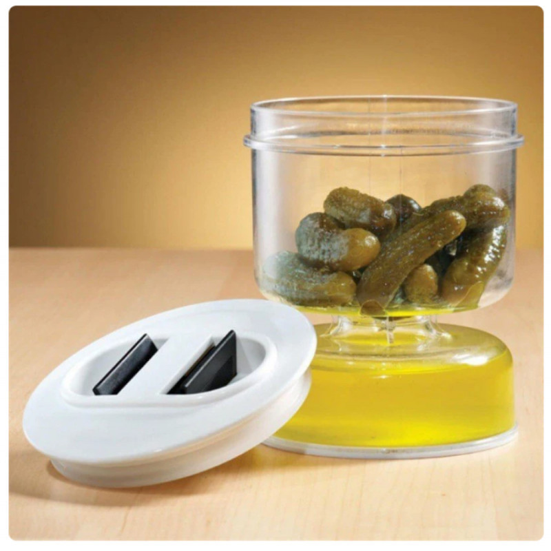 Van egy megoldásunk! A savanyúság és olívabogyó tároló üveg tökéletes választás, amelynek homokóra kialakítása és a folyadék elválasztása miatt képes több napon keresztül frissen tartani a benne tárolt ételt.
