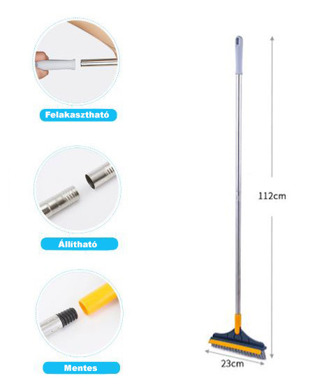 Ez a hatékony 2 az 1-ben súrolókefe, amely ideális foltok, makacs szennyeződések, por és piszkos víz eltávolítására. Ergonomikus tervezése lehetővé teszi könnyű és kényelmes használatát, emellett pedig merev sörtéjű kaparóval és tolható gumikefével is rendelkezik. A kefe PP és alumínium anyagból készült, tartós és erős. Széles körben használható csempepadlón, keményfa padlón, üvegfelületen, cementpadlón, konyhában, fürdőszobában és még sok más területen.